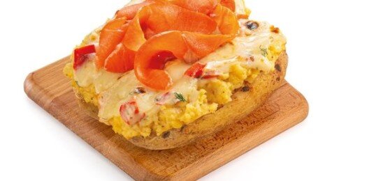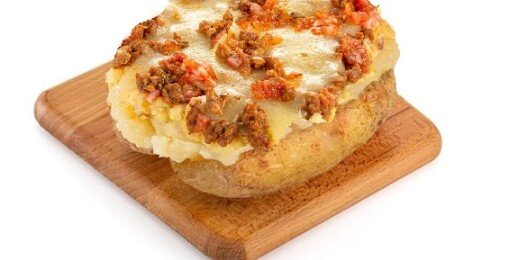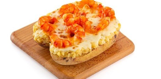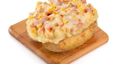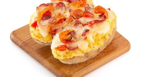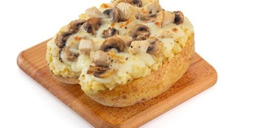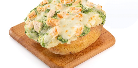 Нежный запеченный картофель с добавлением сливочного масла и сыра моцареллы. С наполнением из курочки.Запекается с сливочным соусом и смеси сыров.Подается с соусом барбекю и хрустящим луком фри.