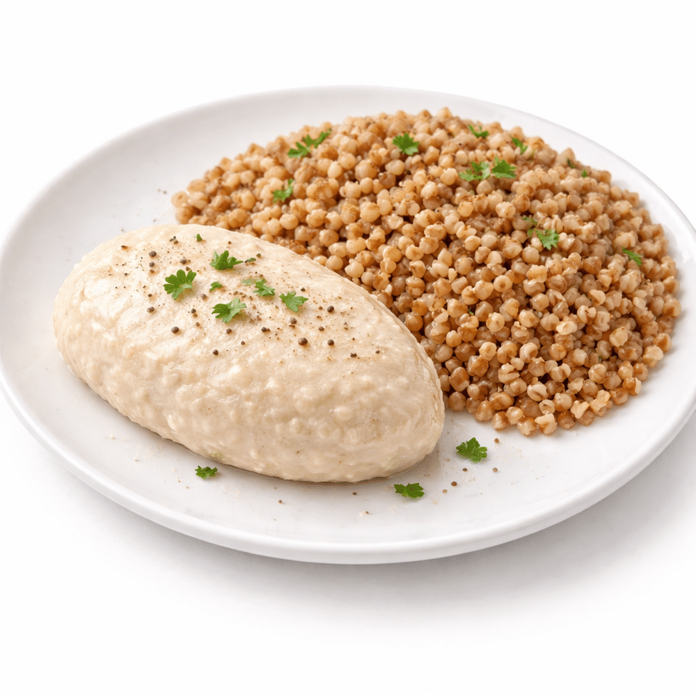 Отварная греча. Котлета куриная на пару без масла.