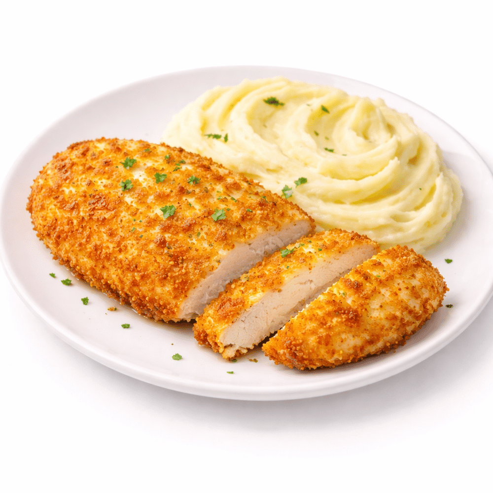 Картофельное пюре с куриной отбивной в сырной панировке